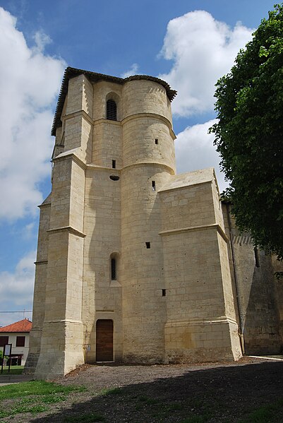 Au-devant de la porte romane et de l’ancienne façade s’élève un clocher du XIVème siècle. Bâti sur un plan carré, il devient octogonal au-dessus du porche. Des trous aménagés dans les murs indiquent le niveau d’un ancien plancher détruit et à la même hauteur, le mur à l’ouest est percé de meurtrières à armes à feu.